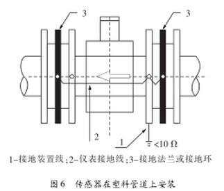 (2)傳感器在塑料管道上或在絕緣襯里的管道上安裝時(shí),如圖6,傳感器兩端必須安裝接地環(huán)或接地法蘭。使管內(nèi)流動(dòng)的被測(cè)介質(zhì)與大地短路,具有零電位,否則污水流量計(jì)無(wú)法正常工作。