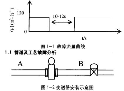 被測液從A流向B(如圖1-2),傳感器水平安裝,電極水平,傳感器下游2m處裝有調(diào)節(jié)閥,從圖中可以排除由于傳感器中急劇潴留氣和傳感器后無背壓等情況導(dǎo)致的測量脈動(dòng)情況產(chǎn)生。