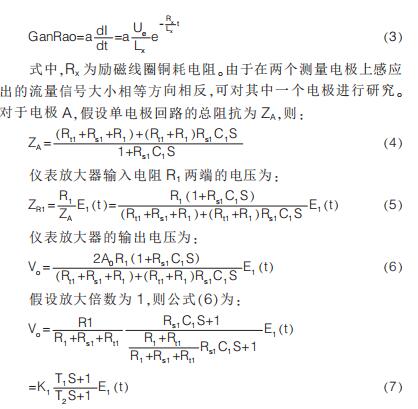 測量電極與流體介質接觸時會發生電化學反應在電極-溶液界面形成阻抗,通常由法拉*阻抗與雙電層電容并聯組成。 法拉*過程分為電荷傳遞過程和擴散過程,相應的法拉*阻抗由電荷傳遞電阻與擴散阻抗串聯組成。一般廢水處理流量計的勵磁頻率大于1Hz,而擴散阻抗發生在更低頻率內,不考慮擴散過程,電極等效阻抗為電荷傳遞電阻與雙電層電容并聯后再與電極接觸電阻串聯。 基于電極阻抗建立的電極等效測量回路如圖 1 所示。圖中:Rs1 和 Rs2 為電荷傳遞電阻;C1 和 C2 為雙電層電容;Rt為兩個測量電極間的接觸電阻滿足 Rt=Rt1+Rt2;Lx 為勵磁線圈等效電感;L1 為閉合回路等效電感;R1 和 R2 為放大器輸入電阻;P1和 P2 為由“變壓器效應”疊加在測量電極上的微分干擾;U1 為流體切割磁力線產生的感應電勢;Ue 為勵磁電壓。 假設磁感應強度由勵磁電流決定且成正比關系即 B=aI,忽略串模等干擾則電極間電壓為感應電勢與微分干擾的疊加,基本方程如下: