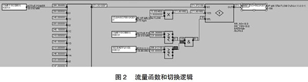 但是由于近期趨勢可能收集不到部分負荷段的相關數據,在超出現有數據負荷的部分應采取必要的補救措施,可以參考相同負荷運行的另一臺余熱鍋爐的主蒸汽流量,以此來彌補現有數據的不足。為了保證數據切換的可靠性,切換條件要嚴謹,現有函數的負荷下線上增加25MW與另外一臺的燃機負荷大于100MW。如此設置的好處是當另一臺運行機組突然故障或跳機時保證數據能及時切換到函數輸出,保證機組的安全運行。具體操作見圖2。