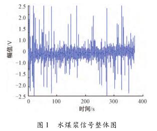 針對出水流量計測量水煤漿時出現(xiàn)較大波動,甚至回零這一問題,特去某煤化工企業(yè)甲醇分公司進行現(xiàn)場數(shù)據(jù)采集。該公司所使用的對置式四噴嘴氣化有4個噴嘴,噴嘴管道口徑為125mm,管中水煤漿流量基本穩(wěn)定在19m³/h(流速約為0.48m/s)。每條噴嘴煤漿線上安裝了3臺出水流量計,每臺出水流量計由傳感器和變送器兩部分組成。選擇其中1條水煤漿管線上的1臺出水流量計進行數(shù)據(jù)采集,因為該臺出水流量計測量結(jié)果波動大,甚至出現(xiàn)回零的現(xiàn)象。將課題組研制的基于DSP的電磁流量變送器的信號線和勵磁線接到該電磁流量傳感器的電極和勵磁線圈上,組合成完整的出水流量計,進行水煤漿數(shù)據(jù)采集。使用的電磁流量變送器是以TI公司DSP芯片TMS320F28335為核心,采用高頻勵磁方案,其硬件主要包括勵磁控制系統(tǒng)和信號采集處理系統(tǒng),具體的模塊有勵磁驅(qū)動模塊、信號調(diào)理采集模塊、信號處理控制模塊、人機接口模塊、通信模塊及電源管理模塊。信號調(diào)理采集模塊中的調(diào)理電路對一次儀表輸出的信號進行放大和濾波,截止頻率是2kHz,放大倍數(shù)約為230倍。通過NI公司USB-6216型號的數(shù)據(jù)采集卡進行數(shù)據(jù)采集,把調(diào)理電路的輸出端連接到數(shù)據(jù)采集卡的一個差分輸入端,并設(shè)置數(shù)據(jù)采集卡工作在差分的測量模式,設(shè)置采集卡的采樣頻率為10kHz。采集多組水煤漿信號數(shù)據(jù),每組數(shù)據(jù)的時間長度為5min。
