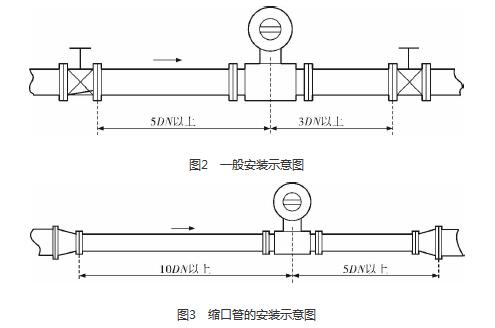 油田污水流量計廠家的安裝質(zhì)量對其測量結(jié)果的影響較大,因此在安裝時需要注意幾個問題。*先,油田污水流量計廠家直管段的選擇在配管時一定要按照要求進行選擇,一般選擇流量計通徑與工藝管道通徑相同,即可滿足工程需要,而且安裝方便、壓力損失小,流量計直管段上游側(cè)的長度不少于5倍工藝管道直徑,下游側(cè)的長度不少于3倍工藝管道直徑(圖2)。但在流速太慢而又要求精度較高或需要變徑的應(yīng)用場合,可選擇通徑小于工藝管道通徑的流量計,以提高測量精度,此時流量計上、下游必須加裝異徑管,且進口異徑管上游側(cè)應(yīng)有長于10倍工藝管道直徑的直管段,下游側(cè)應(yīng)有長于5倍工藝管道直徑的直管段(圖3)。