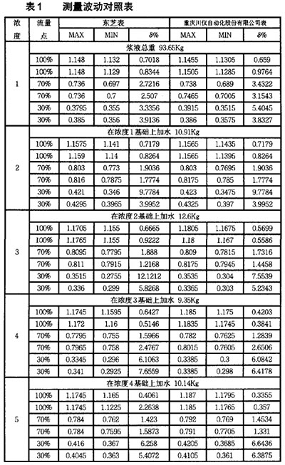在造紙行業(yè)有大量的紙漿液體需要測量,就會用到大量的流量測量儀表,目前在造紙行業(yè)中用于測量流量的儀表,主要有防腐濃硫酸電磁流量計等儀表,因為防腐濃硫酸電磁流量計具有非常強(qiáng)的優(yōu)點,所以非常適合在紙漿的流量測量中使用。在紙漿實驗裝置上,使用串聯(lián)在同一管道上該公司生產(chǎn)的漿液型防腐濃硫酸電磁流量計與日本東芝的漿液型防腐濃硫酸電磁流量計測量不同濃度和流量的紙漿漿液,以驗證其可靠性。波動率對比實驗結(jié)果表明,該產(chǎn)品用于紙漿漿液測量時能夠很好地克服漿液噪聲。在滿流量測量時,上述實驗中各濃度下漿液測量穩(wěn)態(tài)波動率均在1%以內(nèi);其它流量下測量時,由于實驗系統(tǒng)主管道上游分流控制流速不穩(wěn),進(jìn)而導(dǎo)致測量穩(wěn)態(tài)波動率相對較大,甚至達(dá)到近7‰ 但由表1可知,在各種漿液濃度及各流量點下,凱銘儀表有限公司生產(chǎn)的漿液型防腐濃硫酸電磁流量計的穩(wěn)態(tài)波動率始終與日本東芝漿液型防腐濃硫酸電磁流量計的測量結(jié)果一致,從而表明實驗系統(tǒng)的測量結(jié)果能準(zhǔn)確反映實際漿液流量大小。 說明:MAX、MIN分別表示該組數(shù)據(jù)測得流速的的*大值和*小值,單位m/s。