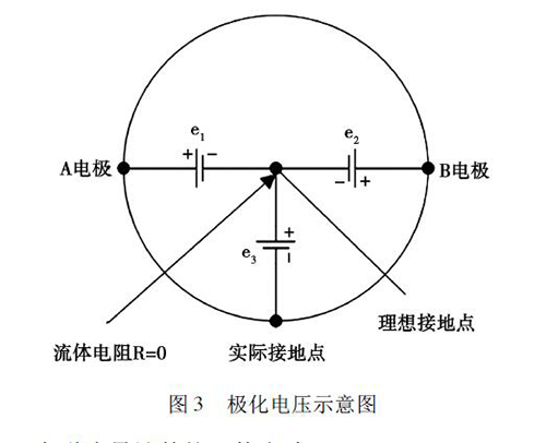 在被測(cè)液體與電極和接液部件接觸過(guò)程中,電解質(zhì)中的正負(fù)離子會(huì)分別作定向運(yùn)動(dòng),這會(huì)使被測(cè)液體在電極和接液部件之間形成電位差,通常將這種現(xiàn)象稱為極化現(xiàn)象。如圖3 所示,理論上來(lái)說(shuō),兩電極A 和B 對(duì)接液部件的電位e1、e2大小相等、方向相反,此時(shí)兩電極的電位差等于零。但是,若兩電極的材質(zhì)或表面狀態(tài)存在差異,此時(shí)A、B 電極之間的電位差就不為零,這就形成了極化電壓,極化電壓與共模狀態(tài)的電壓e3一起疊加在流量信號(hào)中,被輸入轉(zhuǎn)換器的差動(dòng)放大器。當(dāng)極化電壓過(guò)大,則會(huì)對(duì)差動(dòng)放大器的輸入端造成較大影響,導(dǎo)致信號(hào)無(wú)法放大或流量信號(hào)的輸出波動(dòng)過(guò)大,從而降低了衛(wèi)生型卡箍電磁流量計(jì)的測(cè)量精度。