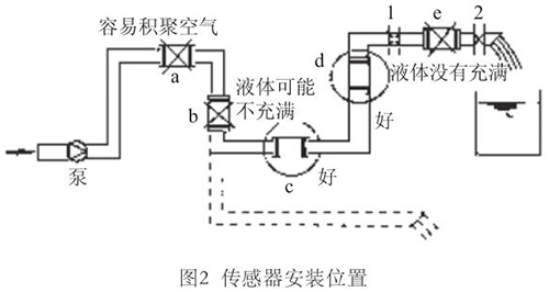液體流動(dòng)方向必須與傳感器殼體上箭頭方向一致。對(duì)于能正反向測(cè)量的智能電磁流量計(jì),若方向不一致雖仍可測(cè)量,但設(shè)定的顯示流動(dòng)正反方向不符,必須改正之。若拆傳感器工作量大,也可改變傳感器上箭頭方向和重新設(shè)定顯示儀表符號(hào)。管道未充滿液體主要是管網(wǎng)工程設(shè)計(jì)或傳感器安裝位置不妥,使傳感器測(cè)量管內(nèi)不能充滿液體。應(yīng)采取措施,避免安裝如圖2所示a,e位置和以虛線管排放時(shí)b位置,改裝到c,d位置。
