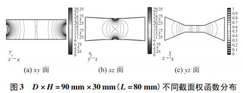 4) 圖 3( c) 、圖 4( c) 的 yz 面權函數分布表明,D = 90 mm時的權函數等勢線間距略大于 D = 60 mm 時的權函數等勢線間距,權函數變化梯度較小,且中心區域的權函數等勢線逐漸變為直線,因此 D = 90 mm 的權函數分布更均勻一些,但是兩者區別很小,即寬度改變對 yz 面權函數分布影響很小。圖 4( c) 、圖 5( c) 的 yz 面權函數分布表明,H = 30 mm時的權函數等勢線間距較大,且中心區域的權函數等勢線逐漸變為直線,因此 H = 30 mm 的權函數分布更加均勻;