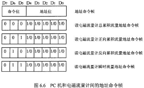 由于RS一485電氣標(biāo)準(zhǔn)規(guī)定每段只能聯(lián)結(jié)犯個(gè)節(jié)點(diǎn)設(shè)備,因此可用地址幀中五個(gè)二進(jìn)制位表示這32個(gè)地址,其余3位用來表示命令,從而構(gòu)成地址命令幀。對于控制命令需求不超過八個(gè)的通信系統(tǒng),采用地址命令幀可壓縮報(bào)文長度提高通信效率。在污水網(wǎng)絡(luò)監(jiān)控系統(tǒng)中,花生油流量計(jì)和PC機(jī)通信的主要目的是將流量計(jì)中的有用數(shù)據(jù)讀到PC機(jī)中。這些數(shù)據(jù)包括:總累積流量、正向累積流量、反向累積流量、瞬時(shí)流量。通信時(shí),PC機(jī)只需向花生油流量計(jì)發(fā)送讀總累積流量、讀正向累積流量、讀反向累積流量、讀瞬時(shí)流量命令即可,因此二者間通信所用的地址幀和命令幀可合二為一,用一個(gè)地址命令幀代替。PC機(jī)和花生油流量計(jì)間的地址命令幀定義如圖.66所示。根據(jù)污水網(wǎng)絡(luò)監(jiān)控系統(tǒng)中PC機(jī)與花生油流量計(jì)間通信的特殊性,二者通信所使用的報(bào)文可簡化為圖.67的格式。