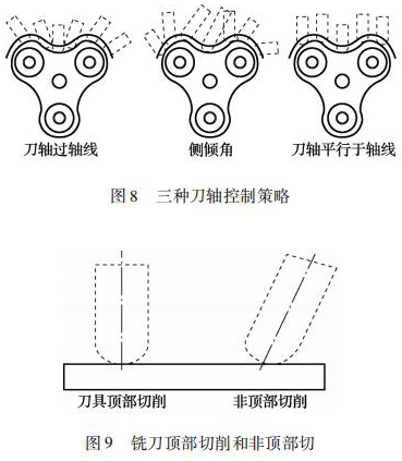 四軸加工中采用球頭銑刀,刀軸控制策略是提高加工效率和轉子曲面表面粗糙度的關鍵。如圖 8所示,刀軸控制策略有常見的刀軸過軸線、側傾角、刀軸平行于軸線。筆者采用平行軸線銑削加工方式對這 3 種刀軸控制策略進行實際加工對比,得出采用側傾角刀軸控制策略加工出的轉子曲面表面粗糙度*好。其原因主要由于刀軸平行于軸線這種刀軸控制策略采用球頭銑刀加工時,其刀具切削轉子曲面時的接觸點為刀具的頂部,球頭銑刀的頂部直徑為零,線速度也為零。此時刀具是在擠壓工件,刀具頂部也容易磨損。刀軸過軸線策略雖然刀具與轉子曲面的接觸點一直在變換,但是也有刀位點是采用刀具頂部去切削。側前傾角刀軸控制策略: 控制刀具與轉子曲面接觸點的位置,避免球頭銑刀頂部銑削轉子曲面,實現刀尖的點的偏離,提高刀具切削點的線速度。球頭銑刀頂部切削和非頂部切削如圖 9 所示。