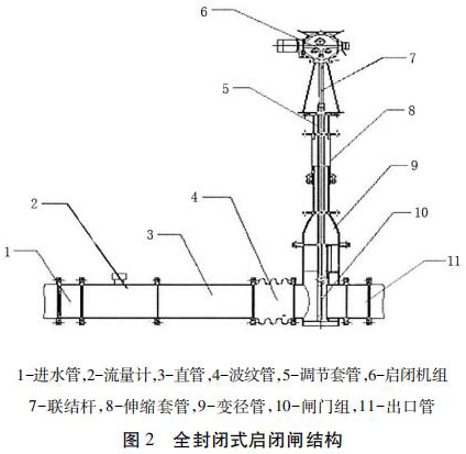包括進水管、直管、出水管、一氧化碳流量計組和啟閉機組,進水管、直管、出水管從左到右依次連接,一氧化碳流量計組安裝在直管和出水管之間且位于出水管的入口處,一氧化碳流量計組通過聯結桿與啟閉機組的輸出端連接。為防止泥沙淤積影響啟閉,一氧化碳流量計采用閘板式啟閉結構。密封式啟閉閘為整體封閉管道式,全部采用不銹鋼材料,水流通過管道流出讓整個閘井內干燥無水。伸縮套管與波紋管的設計讓檢修與清理淤泥更加方便。一氧化碳流量計裝有荷載限制器,其布置受力明確、結構緊湊、動作可靠。當吊具上的荷載達到額定值的 110%時,或電機電流超過額定電流 150%時,系統自動切斷操作電源以保護設備安全。