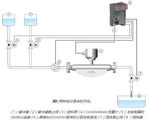 為此,液體管道流量計特別適合。基本版本使用CoriolisMaster類型FCB100。FCH100型CoriolisMaster非常適合衛生應用。它由衛生的連接器組成,具有經過電拋光的儀表管,并通過了EHEDG認證。因此,它可以用于食品領域的任何過程。CoriolisMaster通過Modbus通訊連接到小型控制系統。任何需要的開關輸出或輸入都通過控制器進行。控制器直接通過Modbus從液體管道流量計讀取混合所需的測量值。關于電磁測量技術,高分辨率脈沖輸出用于流量傳輸。