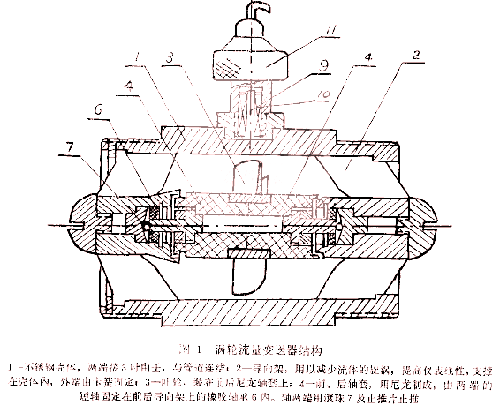 在固井過(guò)程使用重油流量計(jì), 主要解決渦輪變送器的耐高壓、耐震以及高速下的耐磨蝕問(wèn)題。在這方面, 我們采用了耐磨橡膠軸承 , 尼龍軸套, 單滾珠止推等措施, 基本上可以滿(mǎn)足施工要求。結(jié)構(gòu)主要由不銹鋼殼體、導(dǎo)向架、葉輪和前后軸套組成, 見(jiàn)上圖1。