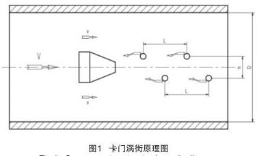 氣體渦輪流量計實現流量測量的理論基礎是流體力學中**的“卡門渦街”原理,在流動的流體中裝置一個非線性三角柱形體,即渦旋發生體,如圖 1 所示。當流體沿渦旋發生體繞流時,會在渦旋發生體下游產生兩列不對稱,但有規律交替地分離釋放出一系列漩渦束,只有當兩渦漩列之間的距離 h 和同列的兩渦漩之間的距離 L 之比滿足 h/L=0.281 時,所產生的渦街才是穩定的。