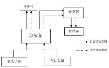安全殼遠傳渦街流量計以總成箱和分支箱為核心。試驗初期,將總成箱置于儀器放置區(qū),分支箱置于貫穿件集中區(qū)域附近,檢漏儀至總成箱再至分支箱之間的管線固定連接,如圖2所示。水法試驗管路與氣法試驗管路互相獨立,總成箱和分支箱的每一路連接采用編號標記進行區(qū)分,并設置控制閥控制開關和流向。