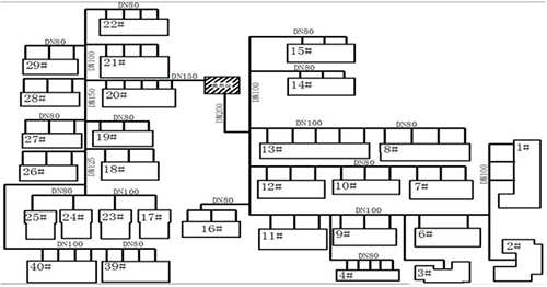 某小區(qū)住宅樓建設于1996年,建筑結構為磚混建筑,建筑面積為54931m2,共30棟住宅樓。2017年繳費739戶,總采暖面積為47141m2。換熱站位于小區(qū)中部,板式換熱機組設計換熱面積為50000m2,循環(huán)泵額定功率為30kW,流量為200m³/h,揚程為32m。庭院管網共分為2個支狀供回水環(huán)路,該小區(qū)供熱管網見圖1所示。