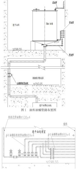 透平油油庫及油處理室設(shè)置在發(fā)電機(jī)出線層。油庫中安裝4個油桶,單個油桶容積為25m3。按照功能劃分為2個運行油桶,2個凈油桶。每個油桶ding部設(shè)置一根油桶進(jìn)油管,油桶下部設(shè)置一根給機(jī)組供油管,油桶底部設(shè)置一根事故排油管,經(jīng)事故排油閥引入事故油池中,事故排油管上引出一根油桶排油管。各油桶的進(jìn)油管、供油管、排油管分別引入油處理室中。具體布置形式可見圖1所示。油處理室中設(shè)置一個容積為1m3的移動油箱,用于向設(shè)備添油或臨時儲油。