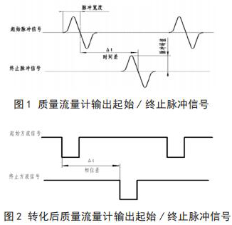 將插入式電磁流量計流量與相關(guān)測試設(shè)備連接起來,就可以進行插入式電磁流量計的校準(zhǔn),時間差△ t 由專用試驗測試設(shè)備可以測出。起始脈沖信號和終止脈沖信號如圖 1 所示。經(jīng)過專用試驗測試設(shè)備信號轉(zhuǎn)化后的信號方波如圖 2 所示。