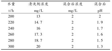 (2)加酸期間附企水處理公司人員負責每0.5h在高架水槽處化驗污環水pH值,每2h監測一次高架水槽內掛片腐蝕情況,將化驗結果告知燃氣崗位人員,崗位職工負責記錄。當pH小于6時,附企給水人員在高架水槽處加入堿液進行調整,同時根據洗滌塔循環水量變換情況調整清洗劑濃度見表3。