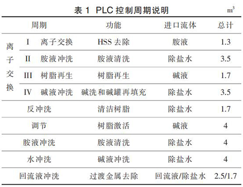 APU 的運(yùn)行按照事先設(shè)定的程序運(yùn)行,即嚴(yán)格遵循設(shè)定的步驟順序。 APU 的正確運(yùn)行依賴于每個(gè)步驟的順利完成。 按照預(yù)先設(shè)定好的步驟完成 1 個(gè)任務(wù)即視為完成 1 個(gè) APU 運(yùn)行的“周期”。 離子交換的主周期被稱為“離子交換周期”。除此之外,整個(gè)控制程序還包含另外 5 個(gè)輔助周期, 分別為反沖洗周期、調(diào)節(jié)周期、胺液沖洗周期、水沖洗周期、回流液沖洗周期。 這 5 個(gè)周期在維護(hù)和非計(jì)劃停車后重新啟動時(shí)使用。 PLC 控制各個(gè)周期的說明見表 1。