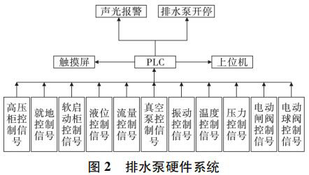 法蘭式渦街流量計自動化運行監控系統主要由 PLC、傳感器、交換機、上位機、監控系統等組成,從而實現水倉水位、水泵運行等全方位進行監控。排水泵硬件系統如圖 2 所示。