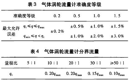 在GB21391--2008《用天然氣渦輪流量計測量天然氣流量》對分界流量q,有明確的定義,即低于該流量要采用擴展誤差限的流量值。標準*5.2條從*大允許誤差和量程比兩方面對分界流量做出了規定,且明確了量程比是在*大允許誤差范圍內流量計的*小流量和*大流量之比。該標準中對渦輪流量計要求的*大允許誤差如表1所示,量程比與分界流量q,的關系如表2所示。