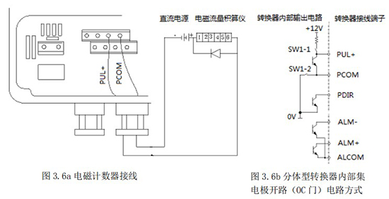 3.4.5 頻率(脈沖)、上下限報警、流向標示等輸出均為集電極開路的電平輸出信號。