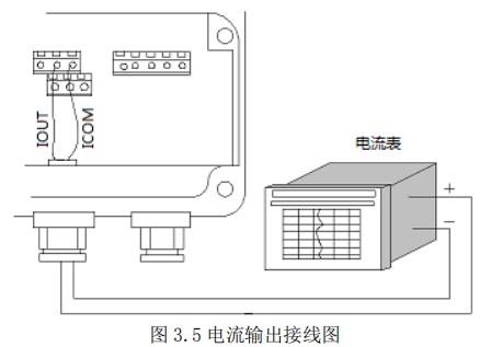 使用電流輸出線(4-20mA)時(shí),應(yīng)注意到導(dǎo)線的電阻與負(fù)載電阻之和不得大于 750Ω 。電流輸出接線見圖 3.5。