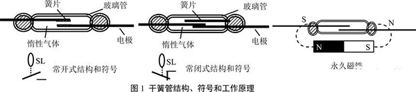 干簧管開關(guān):由一組或幾組導(dǎo)磁金屬簧片封裝在充有惰性氣體的玻璃管中組成的元件,每組簧片既能導(dǎo)磁又能導(dǎo)電,起開關(guān)電路和磁路的雙重作用,如圖1。對(duì)于常開型:當(dāng)干簧管在外加永久磁場(chǎng)或電磁場(chǎng)的作用時(shí),干簧管中的兩根簧片分別被磁化,在兩根簧片接近的地方產(chǎn)生異性磁極而吸引,兩根簧片相接觸使電路導(dǎo)通。反過來,當(dāng)磁場(chǎng)取消時(shí),簧片依靠本身的彈性力恢復(fù)原狀,兩簧片分離,電路斷開,這樣便完成了一個(gè)開關(guān)的作用。常閉型干簧管原理可自行分析。干簧開關(guān)有許多優(yōu)點(diǎn):由于接點(diǎn)密閉在充滿惰性氣體的玻璃管中,不易腐蝕、氧化和污染,接點(diǎn)免于維護(hù);接通或釋放的時(shí)間只有1~3毫秒,僅為電磁繼電器的1/5~1/10,可以作為速動(dòng)開關(guān)使用;由于接點(diǎn)部分使用了金、鐒、鈀合金鍍層,壽命長(zhǎng),開關(guān)約為106~107次。