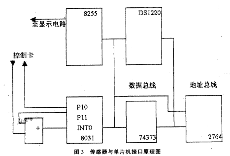圖3中,單片機8031、74373和2764組成單片機核心電路,8255為顯示電路接口,DSl220為不揮發(fā)RAM,用其存儲流量可保證斷電后流量不丟失。工作時8031每隔一個采樣周期先啟動定時器T1,然后通過PIO引腳向控制卡發(fā)控制信號,換能器發(fā)一聲波經(jīng)被測污水反射由換能器接收,控制卡的邏輯輸出端輸出一脈沖,脈沖信號經(jīng)過或門進入INTO腳,引起中斷請求。在中斷服務(wù)程序中從定時器中取出定時值,計算出對應的液位。由于傳感器在發(fā)出聲波后,在4MS以內(nèi)會產(chǎn)生無用的盲區(qū)脈沖,所以在P10向控制卡發(fā)控制脈沖的同時,通過P11引腳發(fā)一個4ms的高電平封鎖信號,防止“盲區(qū)脈沖”通過或門進入INTO引腳。